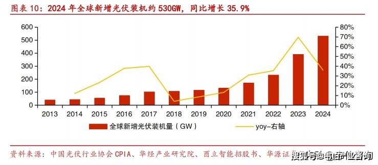 根据IEA预测,2023-2028年,预计全球光伏新增装机2700GW(年均450GW)。我国光伏行业不断快速发展,年光伏新增装机量连续11年位居全球首位,累计装机量连续9年位居全球首位。