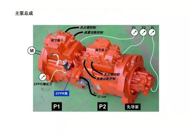 常见大中型挖掘机一般将柱塞泵和齿轮泵集合在一起,组成液压泵总成,一般主泵为柱塞泵(输出液压油压力较大)给液压行走马达、液压回转马达、液压油缸供油;先导泵为齿轮泵(输出液压油压力较小)给分配阀供油。