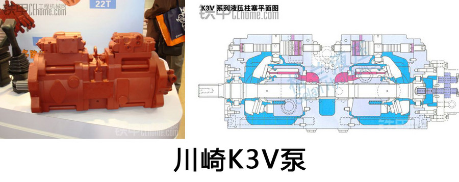 川琦的K3V泵在挖掘机上使用较多。挖掘机主泵采用的一般都是双泵,额定压力为34MPA,瞬间最高压力可达39MPA。之所以柱塞泵的泵油压力比齿轮泵,是因为其做功和容积效率更高。目前大量使用的液压挖掘机都采用斜盘式变量轴向柱塞泵。通常都采用双泵,用一根通轴将两个柱塞泵串联在一起,所以也称为通轴泵。使用在挖掘机上的通轴泵还可以再串一个小齿轮泵作为伺服泵(就是先导泵)使挖掘机的部局大为简化。