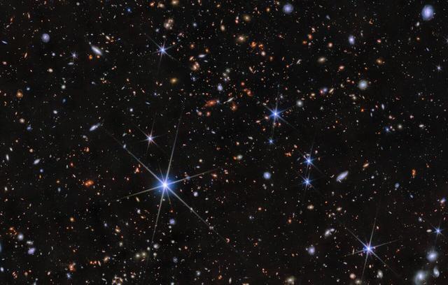 在这幅图像的中心,隐约可见稠密的星系场,是迄今为止发现的最遥远的螺旋星系——烛龙星系。它拥有清晰可见的旋臂、中央的古老核球和一个巨大的恒星形成盘,与银河系的结构相似。该星系是在全景巡天(PANORAMIC Survey)——一项由詹姆斯·韦伯太空望远镜(JWST)进行的广域成像巡天——中发现的。图片来源:NOIRLab/NSF/AURA/NASA/CSA/ESA/M. Xiao(日内瓦大学)/G. Brammer(尼尔斯·玻尔研究所)/D. de Martin & M. Zamani(NSF NOIRLab)